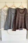 大U領設計露出鎖骨線條,橫紋編織讓視覺更有層次感,搭配腰間最寬、胸圍與下擺略收的修飾版型,自然拉長上半身比例。