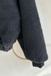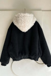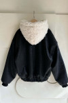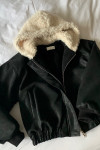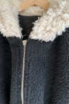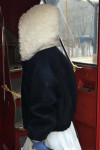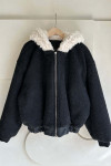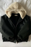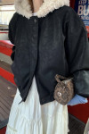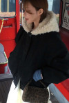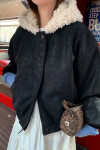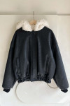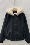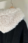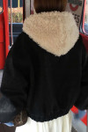 拼接美感:領口和連帽處的羊羔毛與外層的深色皮感形成強烈對比,視覺上顯得溫暖且有層次。